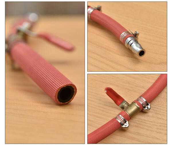 3. **Compatibility**: The hose typically features connectors that fit standard fittings on glaze blowing pots and air pumps, ensuring a secure and leak-free connection.