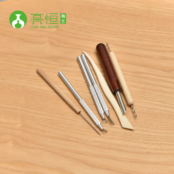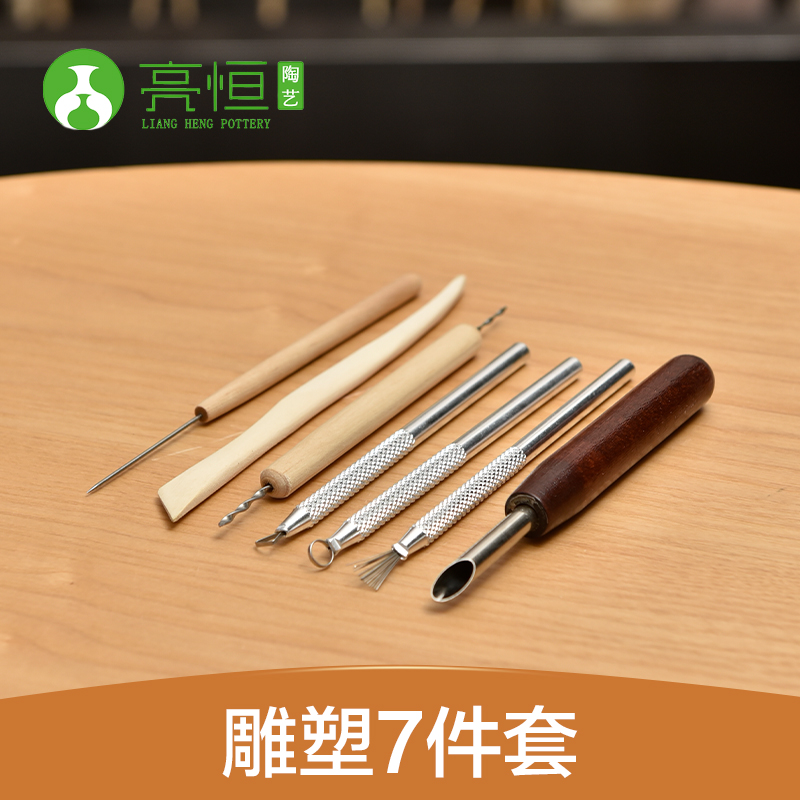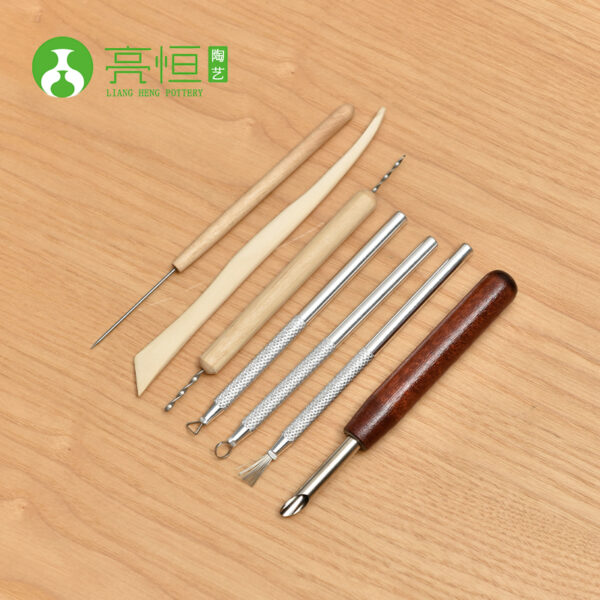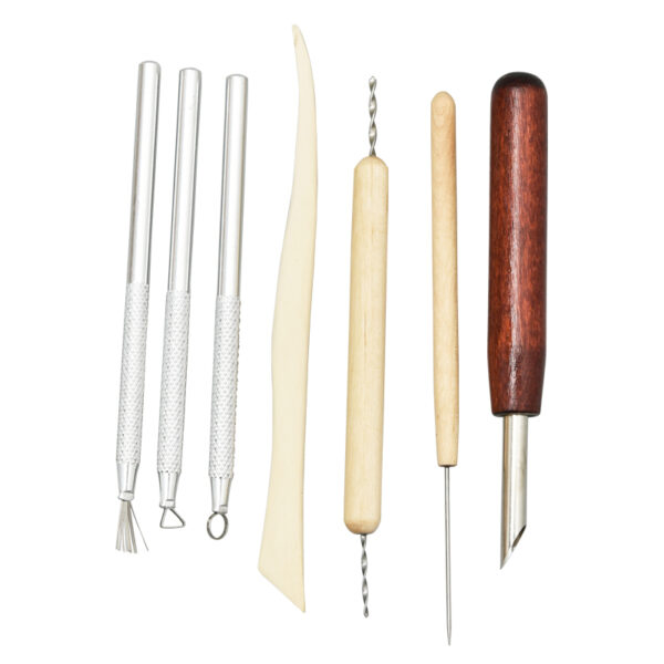 The sculpting tool set of 7 is a comprehensive collection designed for artists working with clay, allowing for a wide range of techniques in shaping, carving, and detailing. Each tool in the set features a unique design tailored for specific tasks, from fine detailing to broader shaping.