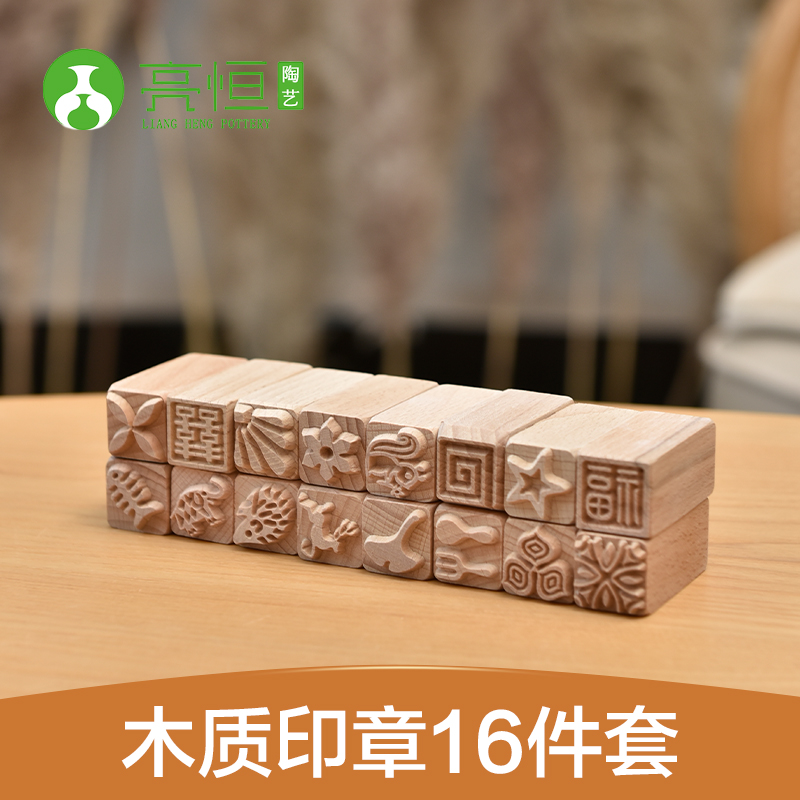 The wooden stamp set of 16 is a collection of versatile stamps designed for adding unique designs and patterns to pottery and other crafts. Each stamp features a sturdy wooden handle for comfortable grip and control, making it easy to create intricate impressions on clay surfaces.