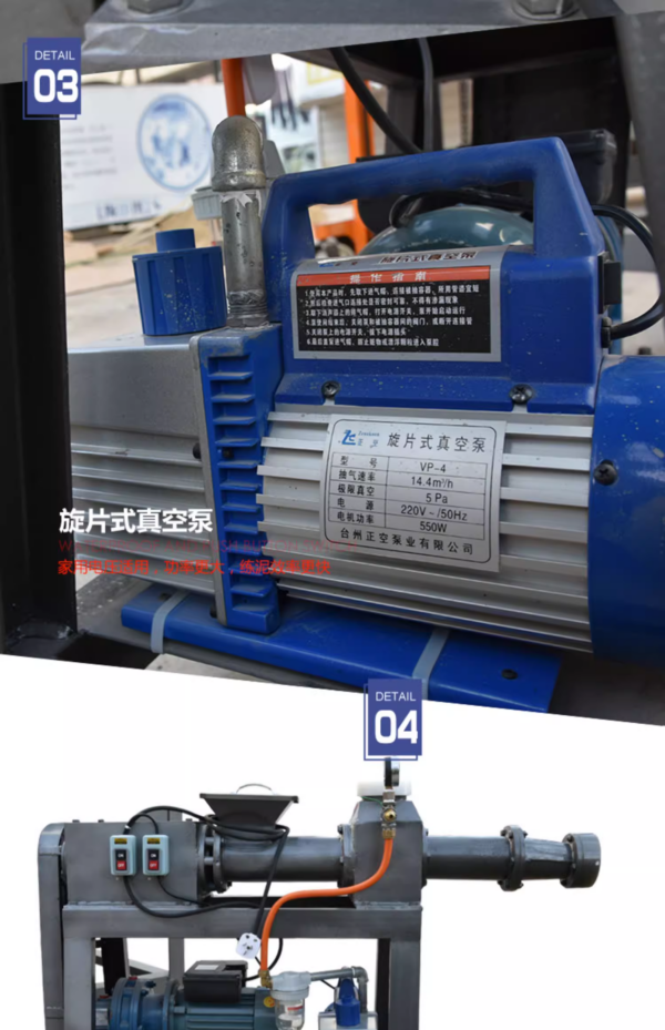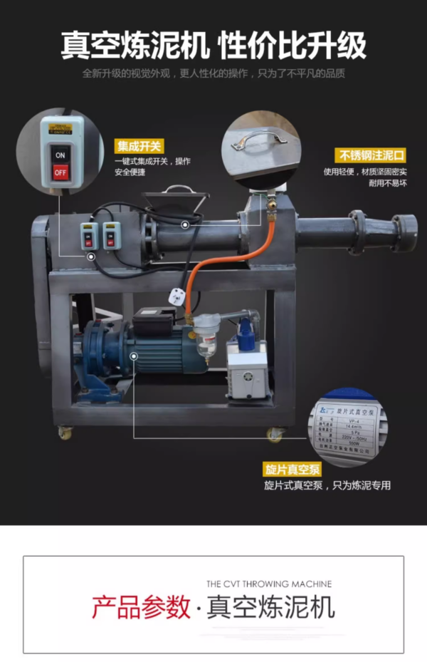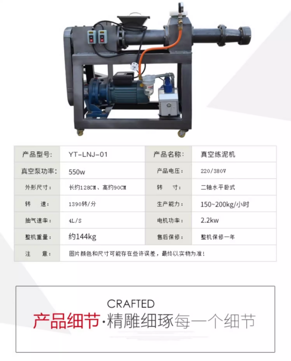 Equipped with a shock-resistant vacuum hydraulic gauge with clear scales, accurate and quick readings, safe and reliable. The outlet is finely polished for smooth clay discharge. Through a grid plate, the clay is extruded into thin strips and enters the vacuum pump to produce high-density and highly plastic green bodies from the machine nozzle. Twin-shaft stainless steel spiral blades ensure smooth clay feeding and strong input without overturning. It is more delicate pugging. No coating prevents clay contamination.